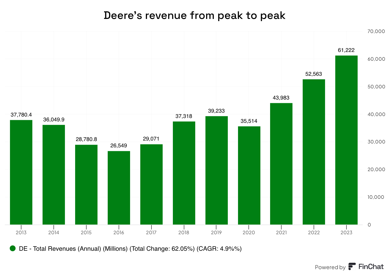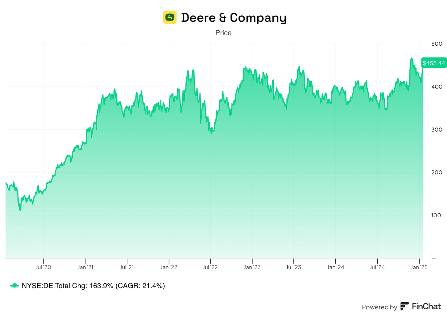 Deere is currently experiencing a downturn after the agriculture industry peaked in 2023. 2024 was the first year of this downturn, and 2025 is also expected to be a down year.