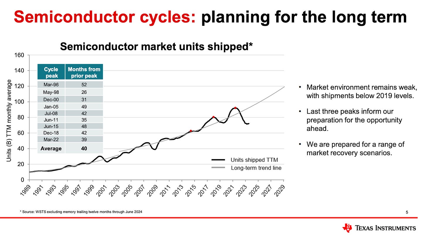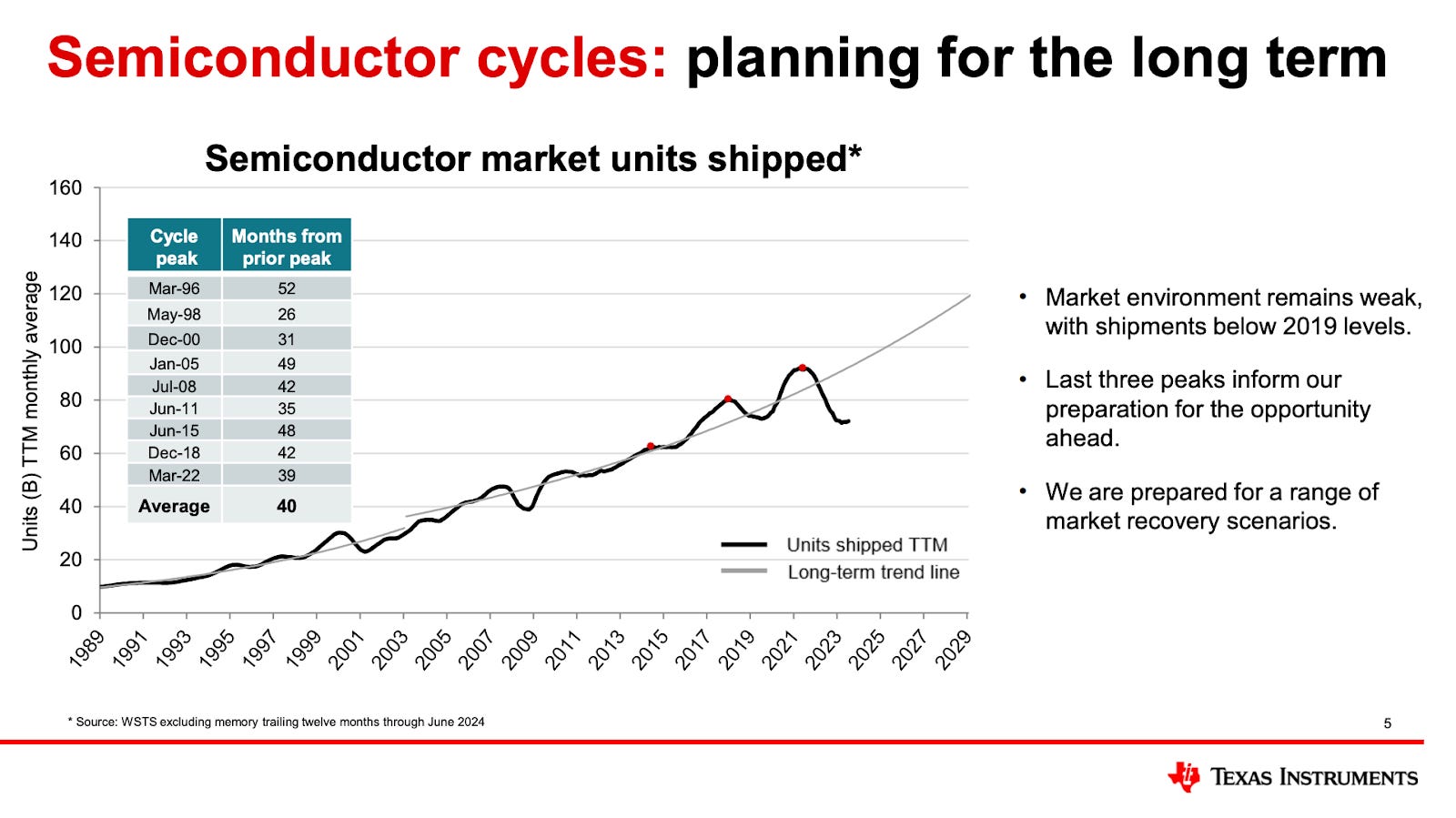 The semiconductor industry is a perfect example of an industry that belongs to the second group. It’s a cyclical industry due to a supply/demand imbalance created by long supply lead times coupled with fast demand changes (which means that supply might come online when demand has already shifted). Despite these historical cycles, the long-term trend has remained unstoppable: up and to the right. I believe this chart from Texas Instruments’ recent capital management update illustrates the point well: