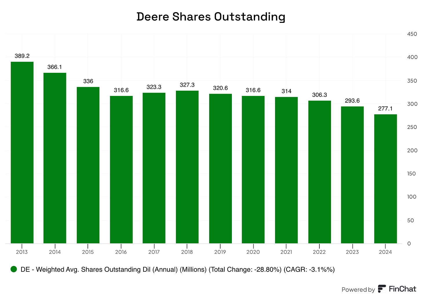 Thanks to this cash generation capacity, Deere can invest countercyclically, both in the business (through R&D and Capex) and in stock buybacks. The management team leans quite heavily on buybacks even during tough times, which has resulted in a 29% decrease in shares outstanding over the last 10 years and 14% over the last 5: