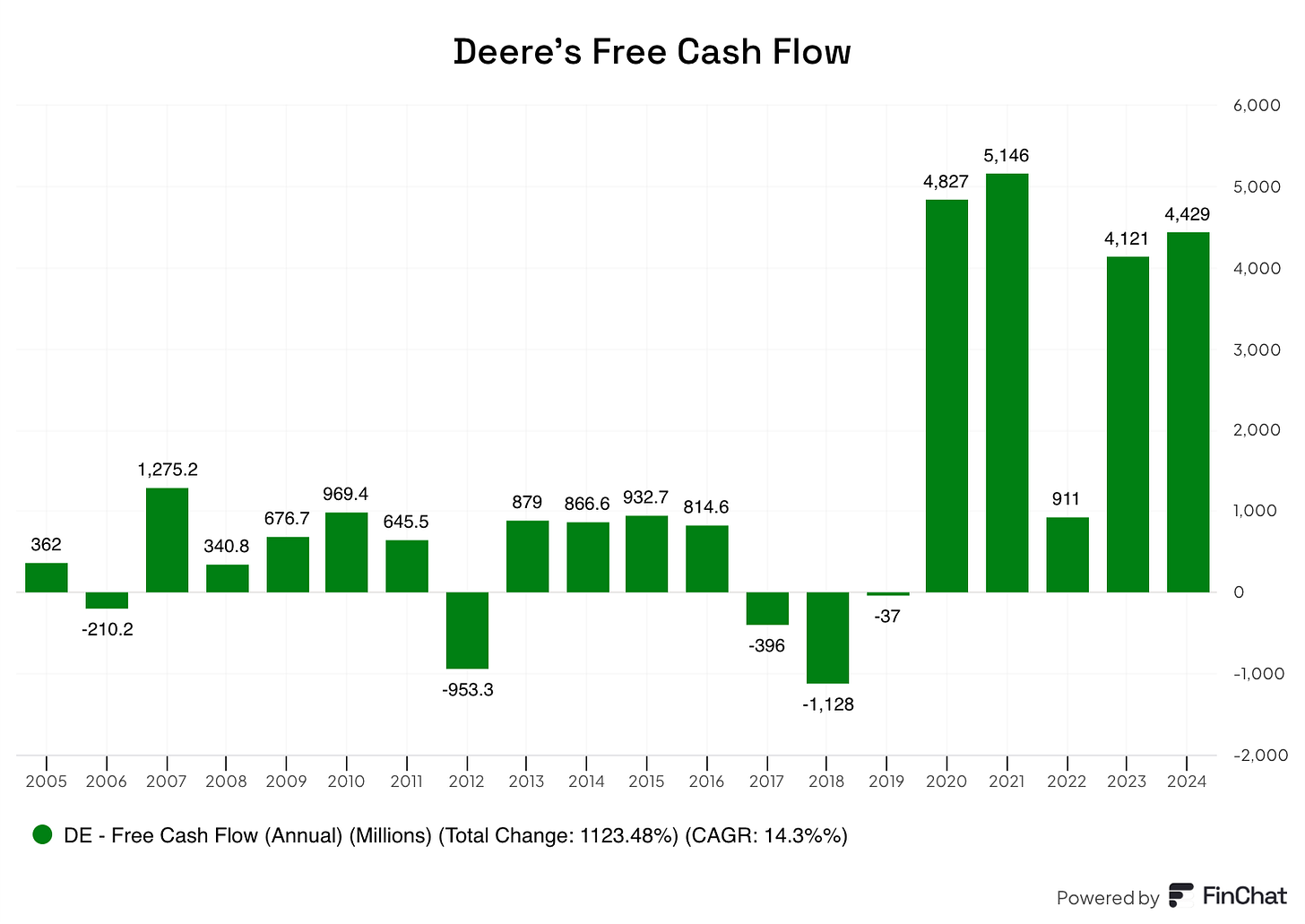 Something worth noting is that the cash flows of many industrial companies tend to be countercyclical. The reason lies in inventories. During an upcycle, these businesses run with high inventory to meet demand. This increased inventory ties cash into working capital. When a downcycle comes, these companies reduce inventory, which frees working capital and improves cash flows. Deere significantly reduced inventory in 2024 to adapt to the demand environment, which has allowed its cash flows to be more resilient when it matters most.