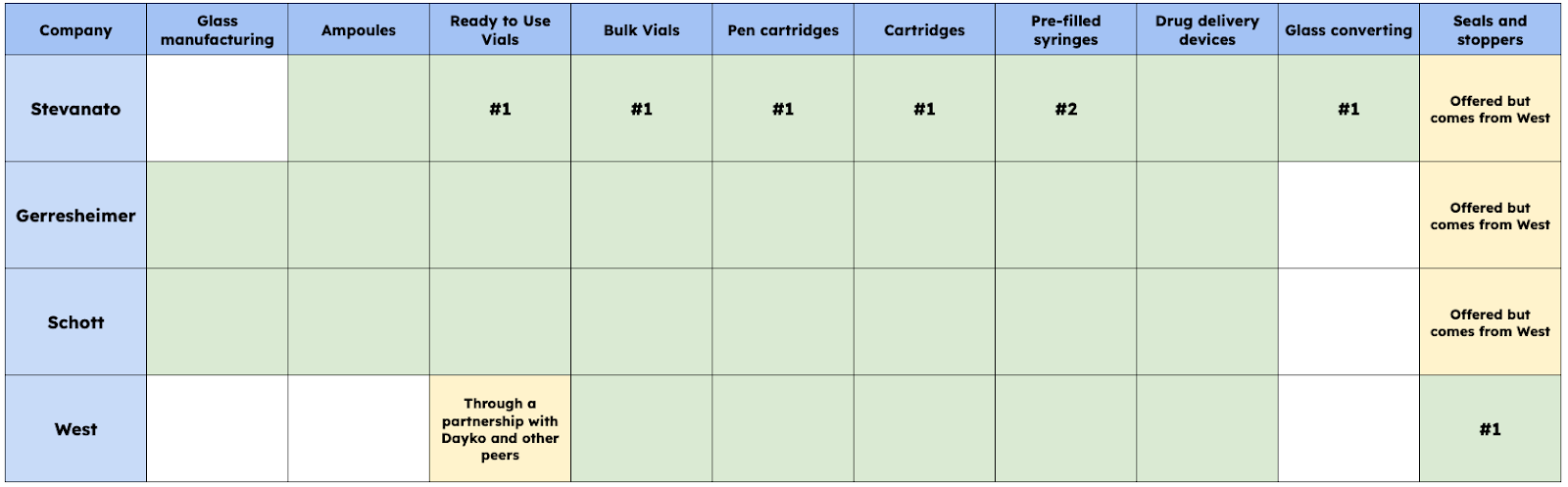 Stevanato has three main peers in the industry: West Pharmaceuticals, Schott Pharma, and Gerresheimer. These four companies (the three I just mentioned plus Stevanato) make up most of the volume in the drug containment industry. Their portfolios are pretty similar but have some differences. I built this table comparing where the different companies are present and where Stevanato and a few others lead: