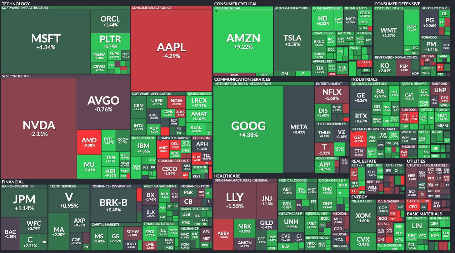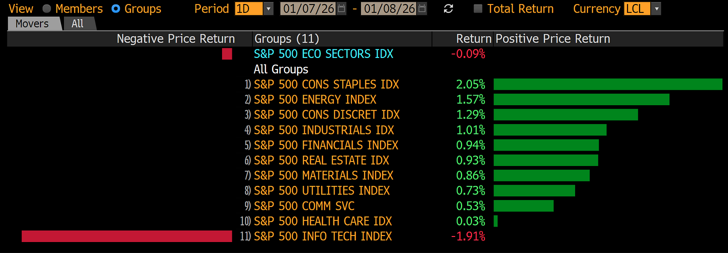 Should investors adapt by changing their investment style? The quick answer is “no” because fundamentals end up mattering sooner or later, but it doesn’t hurt anyone to be aware of how markets have shifted. The goal should be to try to make this new market structure become a tailwind rather than a headwind. A quick look at the daily performance across different market segments should help us understand that stock prices over the short term are driven by all but fundamentals. 2025 was a year in which tech (understood as AI and semis) was up pretty much all the time and pretty much everything else was red or weak. We have had one day this year in which it was the opposite (signs of what’s to come? we’ll see):