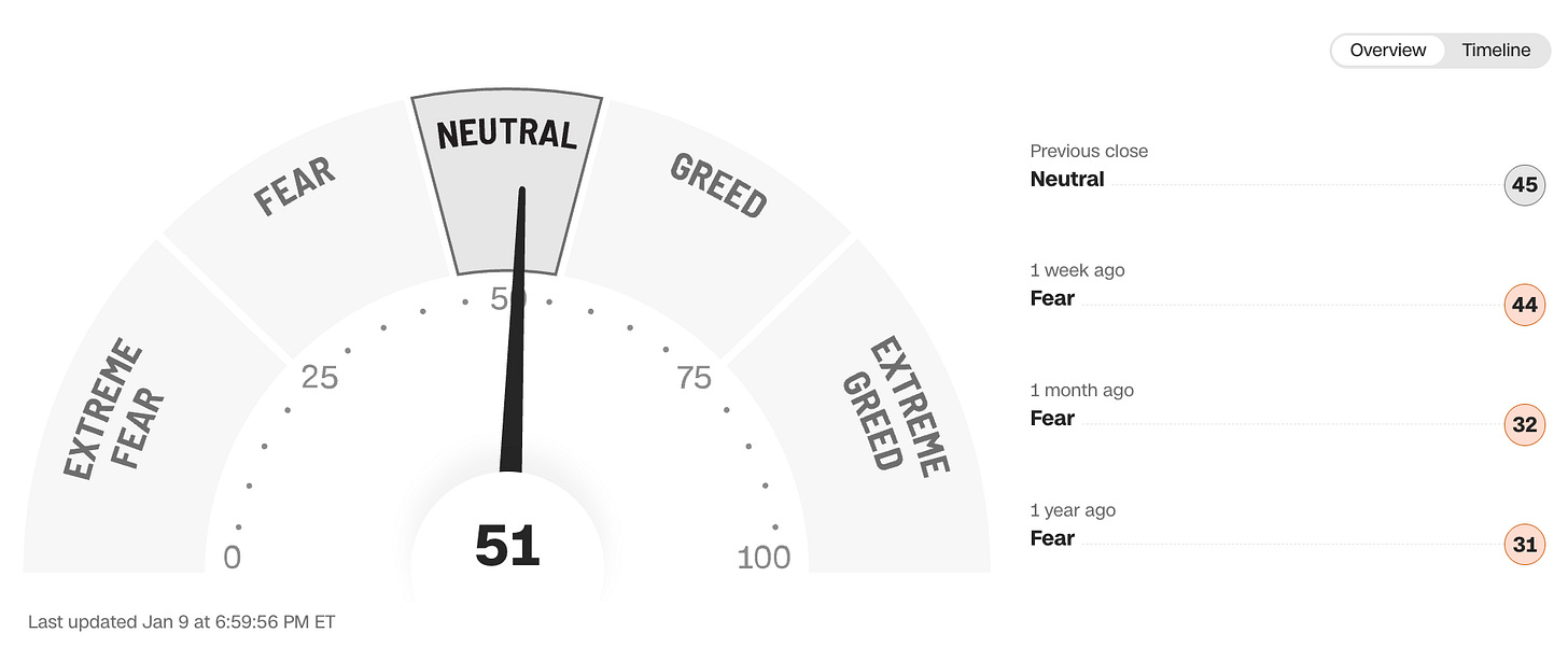 The fear and greed index remained in neutral territory this week, which is strange considering that I’ve seen at least 20 to 30 accounts already sharing YTD performances one week into the year!