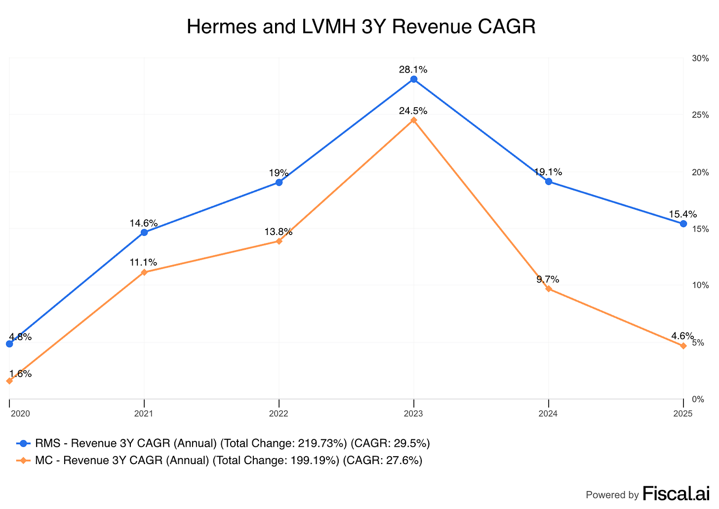 One of the best things about Hermes is that, even if it slightly underperforms on the way up, it tends to make up for more of said underperformance on the way down. In the graph below, you can see Hermes' 3-year revenue CAGR compared against that of LVMH. On the way up, one would be inclined to ask: Why would I pay up for Hermes when it’s growing at a similar rate to LVMH? This question quickly dissipates when times get rough because the gap widens significantly. Note that, in the most recent 3-year period, Hermes has achieved a 15% CAGR in revenue compared to LVMH’s 4.6%. This is the reason why the market is willing to pay up for Hermes: