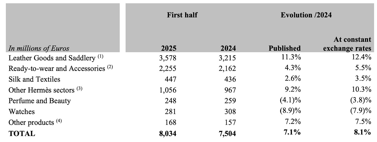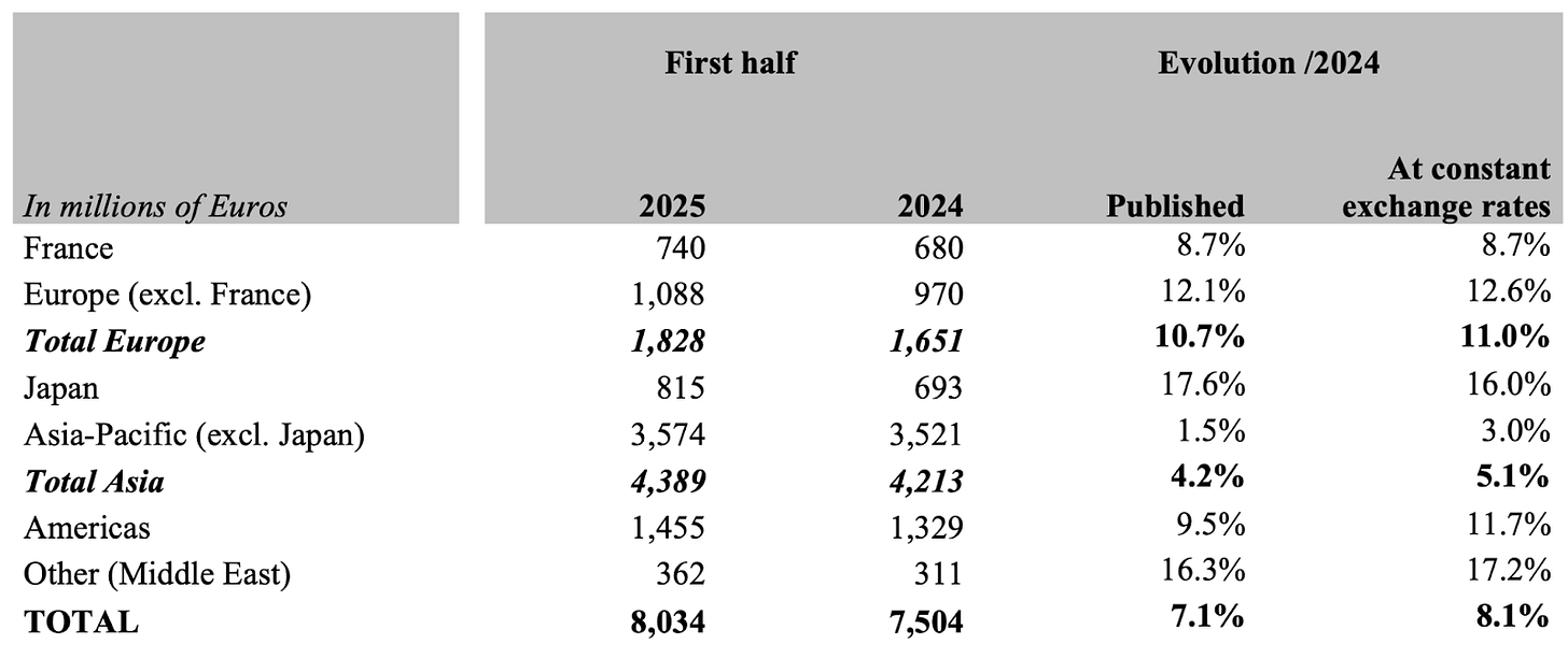 Hermes delivered 8% organic growth in revenue for H1 2025, posting growth in all geographies. Europe, Japan, the Americas, and the Middle East were particularly strong: