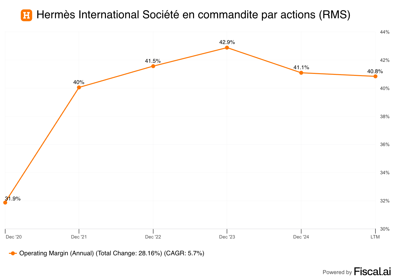 Hermes invested €300 million into its operations in H1 and expects to invest around €700 million in H2. If we look at more of a longer-term trend, we can see that the company’s margins have been dropping after peaking in 2023: