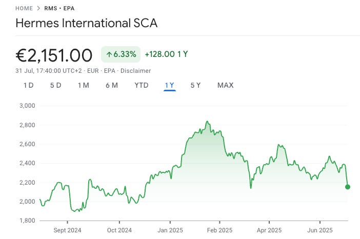 Many of you have asked me if I would be willing to add to my Hermes position now that it’s down 20% from its highs. I have a small position with a cost basis €1,812, and I would like to boost it if the market gives me an opportunity, but is this the opportunity I was waiting for? Let’s take a look.