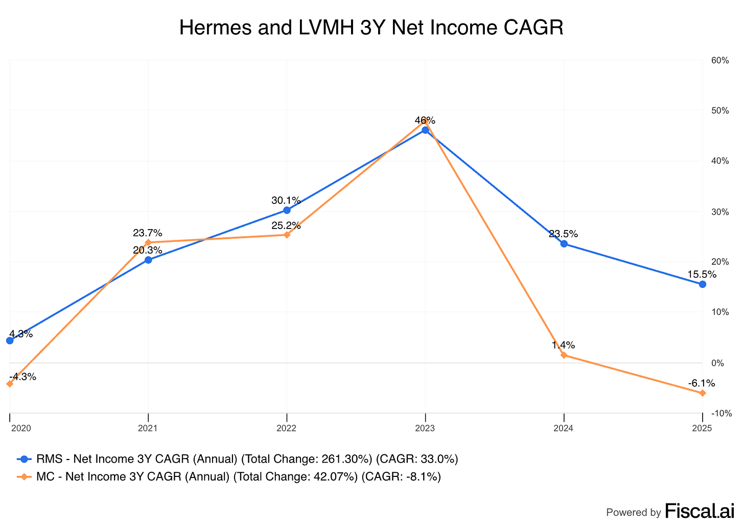This effect is exacerbated when looking at profits. During the good times, LVMH managed to grow its earnings faster than Hermes at some point. Now, when things got rough, LVMH’s earnings declined, whereas Hermes still managed to post a 15% CAGR. This means that the starting point of the next upcycle for both companies is probably going to be very different: