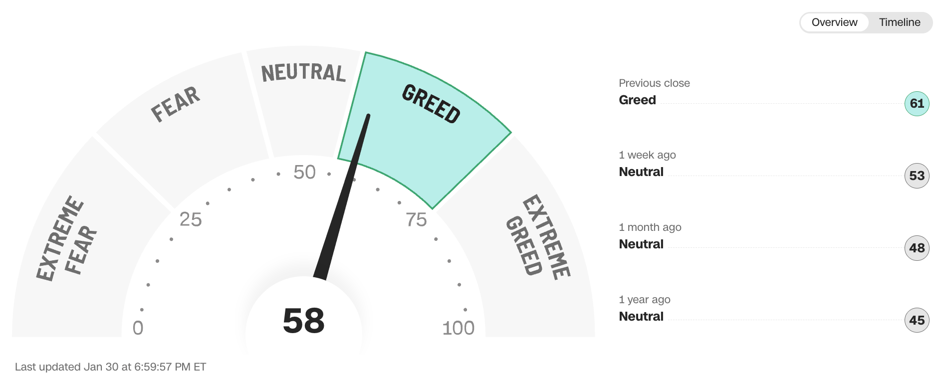 The fear and greed index improved to greed territory although I must say I see all but greed across my portfolio!