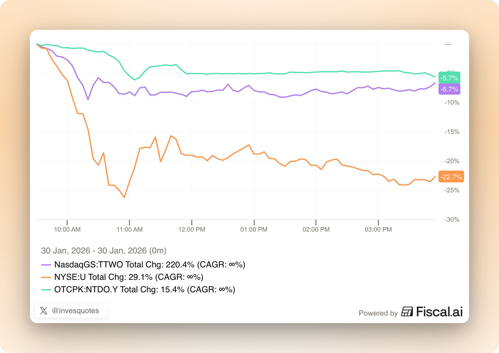 AI also took another victim this week: the videogame industry. Google unveiled Project Genie to develop “worlds.” The market believed this was terrible news for game developers (and their picks and shovels) and decided to indiscriminately sell the stocks of several videogame-related companies. Take a look at how much stocks like Take Two (TTWO), Unity (U), and Nintendo (NTDOY) declined on Friday: