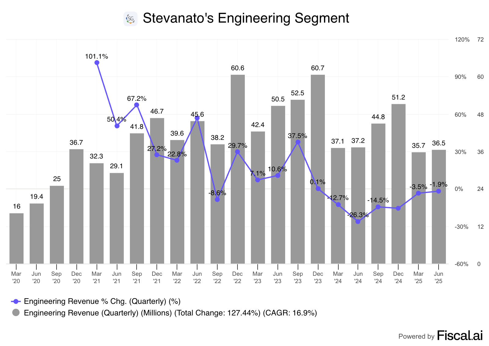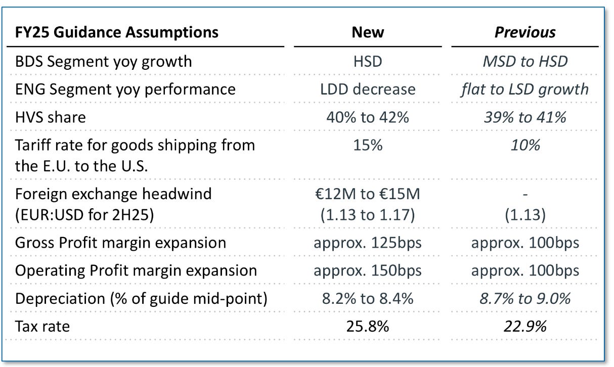 This was the only negative revision in the guide, which went from flat/LSD growth to LDD decline. Management claimed that they still expect sequential improvement in Q3 and Q4 for engineering, but this still results in a year-over-year decline as comps get much tougher in the second half. Suppose we assume engineering revenue improves 5% sequentially in Q3 and Q4 (much lower than the step-up the segment typically sees in the second half). In that case, we get to 2025 revenue of around €151 million, which is consistent with a low double-digit decline for the segment. A 10% year-over-year drop would result in engineering revenue of around €153 million.