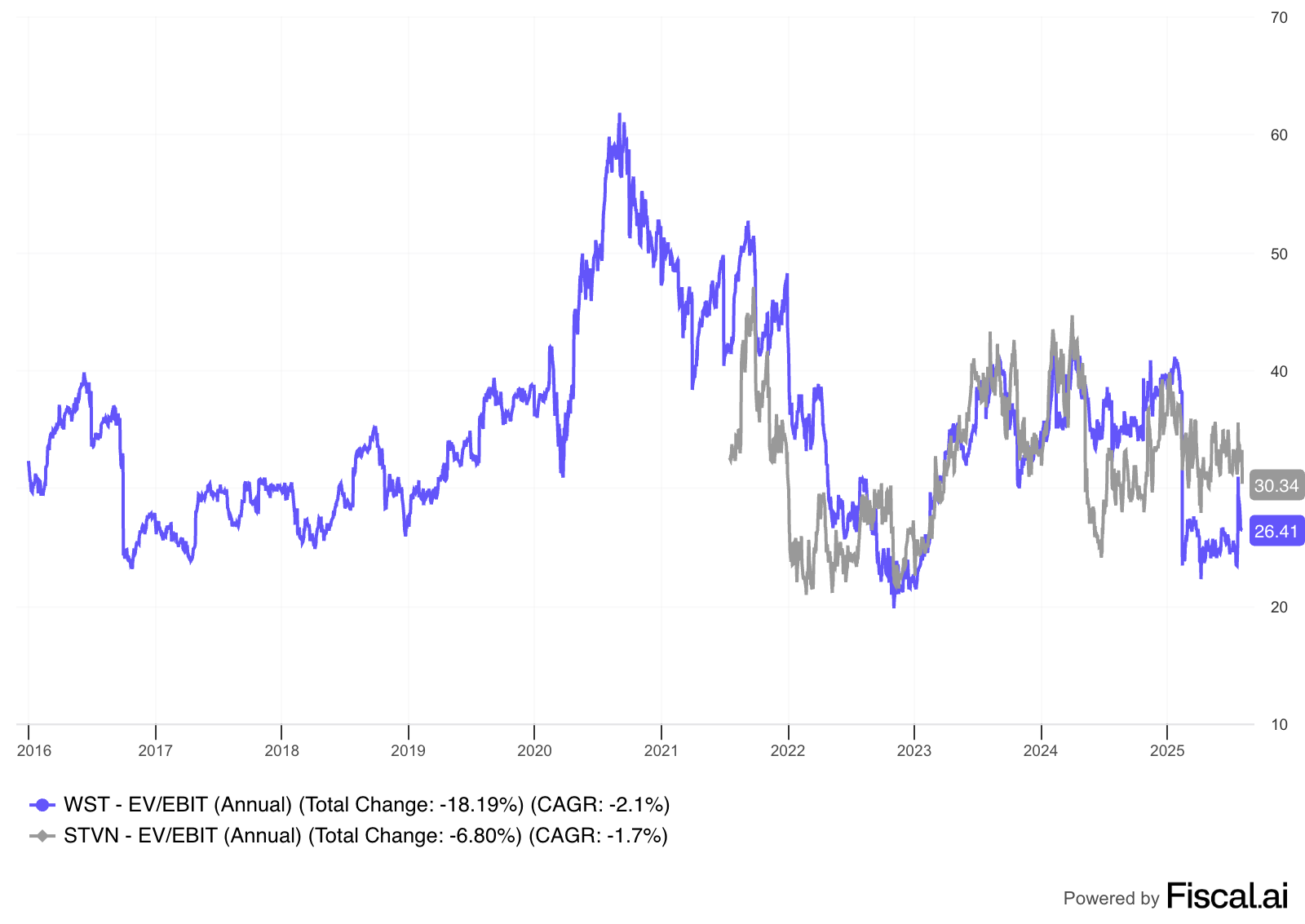 I expect Stevanato’s margins to continue expanding as it grows over the foreseeable future. With management expecting a recovery in engineering and the continued ramp-up of Latina/Fishers + the high-value solutions, we shouldn’t be surprised to see gross margins approaching 40% (or higher) by the end of the decade (I might be a bit conservative here and I’ll later explain why) from a current level of 28%. This would be a 1,200 bps gross margin expansion in under 5 years, while at the same time experiencing top-line growth of HSD/LDDs. The EV/EBIT multiple is optically high, but Stevanato can enjoy strong earnings growth over the next decade+ (especially as margins normalize). Note that West Pharmaceuticals is not trading at a dissimilar EV/EBIT despite having far fewer tailwinds at its disposal: