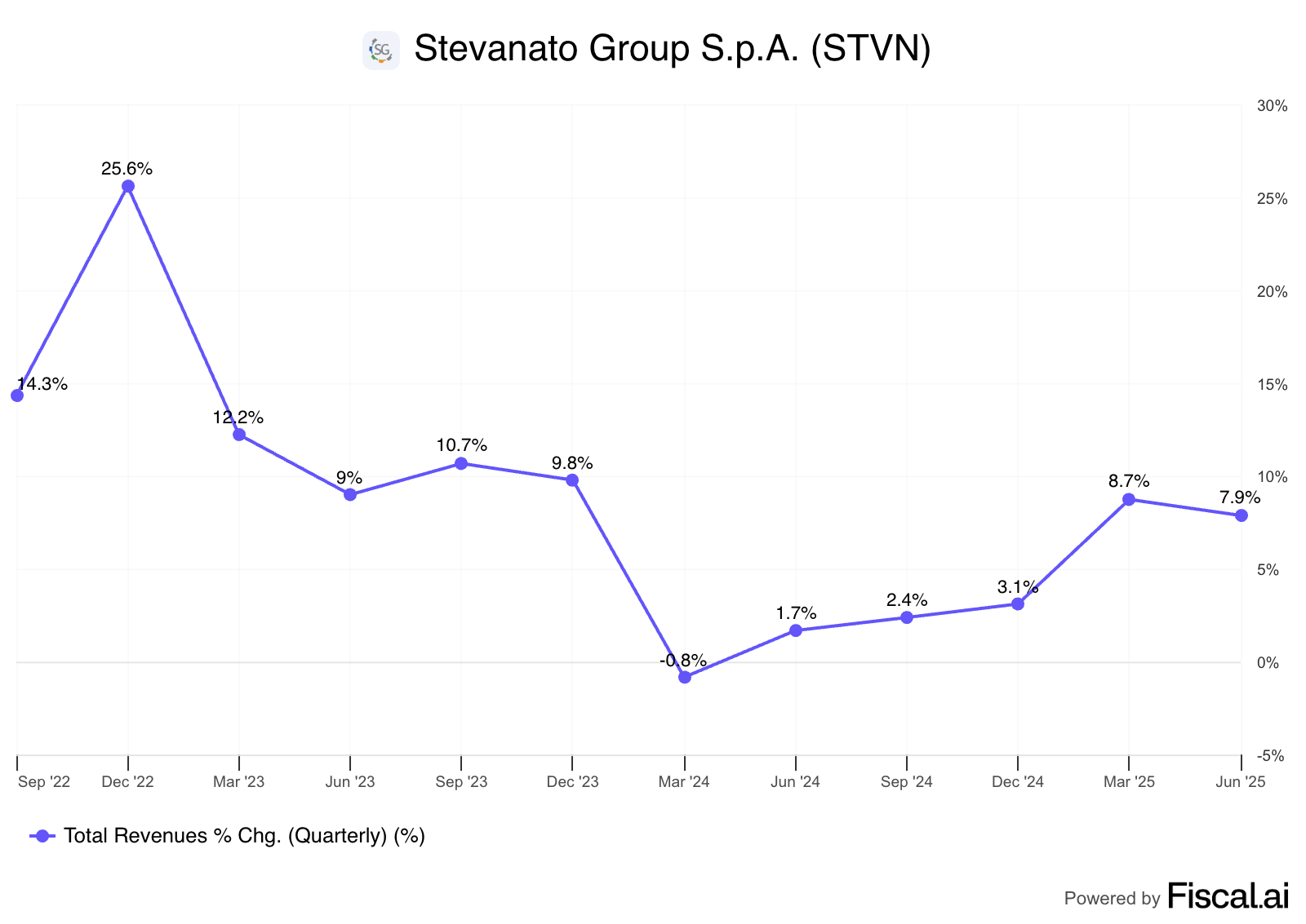 Stevanato delivered another solid quarter in terms of growth and margin expansion. Revenue came in at €280 million, growing 8% on a reported basis and 10% on an FX-neutral basis. Note that Stevanato reports in Euros, and even though the company hedges some of its currency exposure, a weaker dollar is a headwind. Revenue growth has accelerated materially after a weak 2024 (destocking):