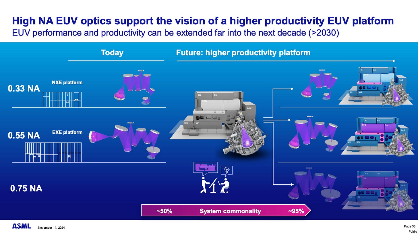 Secondly, ASML is not standing still. Besides improving the productivity of its recently-launched high-NA system, ASML continues to work on the new generation: hyper-NA EUV. Even though hyper-NA is not expected this decade, ASML has shared that they are working on the technology and that the barrier thus far is one of cost (rather than technology). This is historically how ASML has operated: figure out the technology first (i.e., understand what’s possible), only to then lower the cost to drive adoption. They seem to be addressing the “cost problem” through tool commonality (albeit this is a topic for another article):