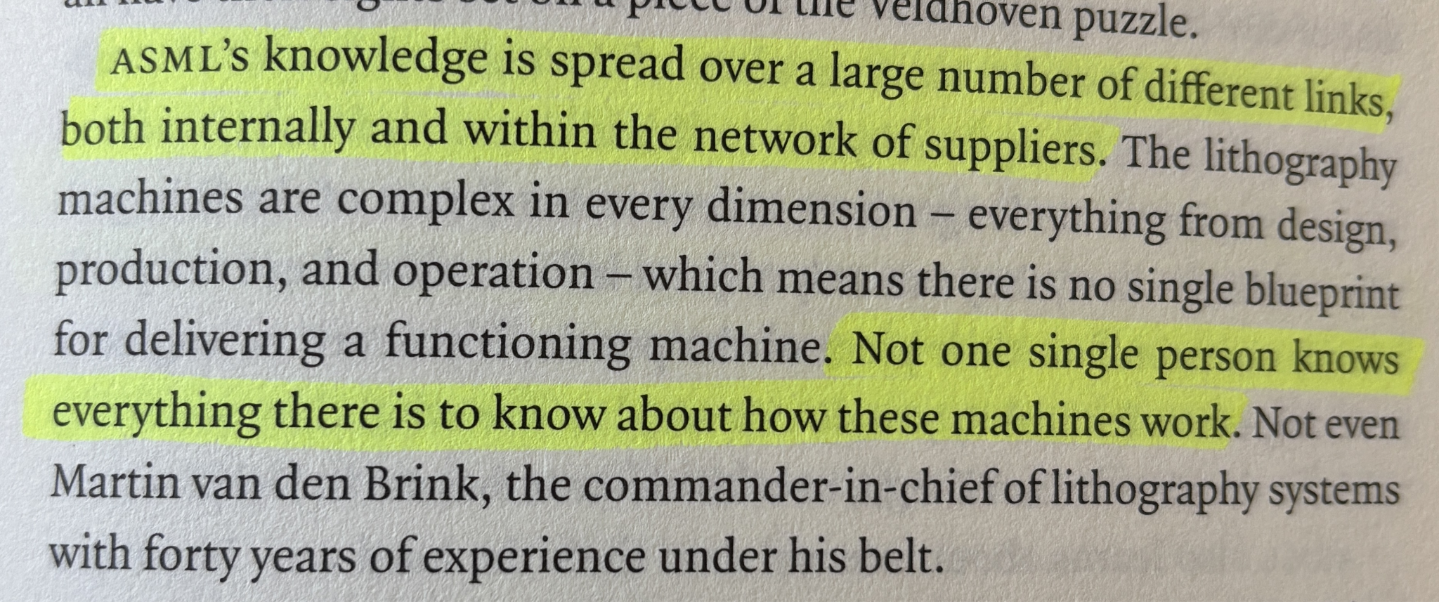 The complex supply chain and ASML’s role as an assembler within it mean that a copycat would not only have to mimic one company but also a highly complex supply chain. After the challenging task of mimicking said suppliers, the copycat would have to be able to assemble said components so that they work at scale. The book ‘Focus: The ASML Way’ explains that there’s not one single person at ASML who knows how an EUV system works: