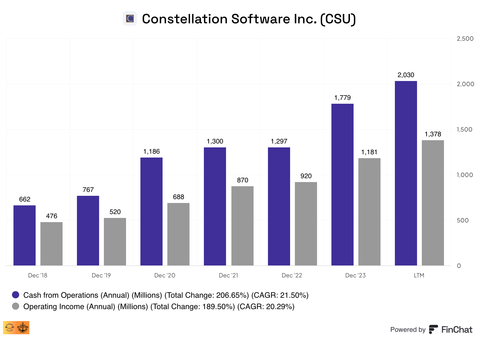 Cash flow can be volatile from quarter to quarter, but over the long term, it should move in the same direction as operating profits (up and to the right, hopefully). Over the last 5 years, Constellation has grown its Operating Cash flow (21.5% CAGR) at a similar pace to its Operating Income (20.3% CAGR):