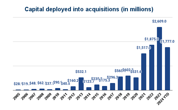 Constellation deployed $267 million into acquisitions in Q3 (including contingent considerations). This is significantly lower than last quarter (when the company deployed $624 million), bringing the YTD figure to $1.4 billion. Adding the company’s open commitments as of September (which might or might not result in capital deployed in Q4), the YTD figure goes up to $1.8 billion. This is an okay figure but much lower than last year’s, which is fair to say seemed like an outlier driven by Altera (+$700 million):