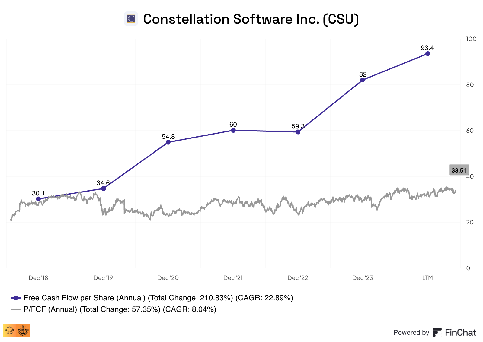 Some will say this kind of performance is unsustainable over the long term. While I do agree with the unsustainability of Constellation compounding at a 30% CAGR going forward, it’s worth considering that most of this return has come from outstanding fundamental performance. FCF per share over this period has grown at a 23% CAGR, with the remaining CAGR coming from multiple expansion (8%):