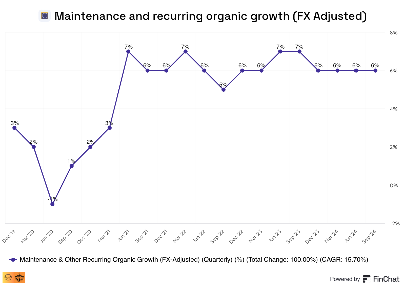 This deceleration has been the norm since Constellation started to face tougher comps. As discussed in past articles, the company probably took advantage of inflation to raise prices in 2023. With CPI subsiding, it’s arguably much tougher to do that now, so some kind of deceleration in the growth rate should not be seen as unusual. This said, the resilience of organic growth in maintenance and recurring revenue continues to surprise. This revenue source grew 6% organically and has been above 5% for 14 quarters in a row: