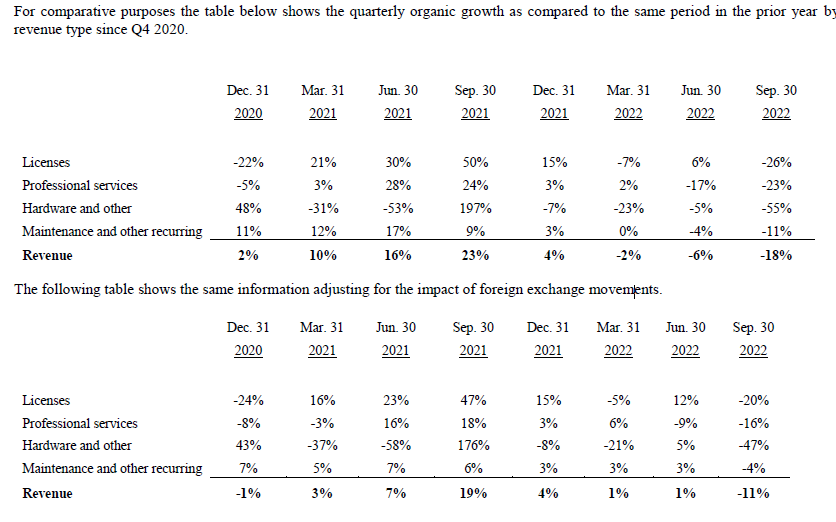 The negative organic growth is primarily a result of high organic growth for the 2021 comparison periods, in particular in Q3 2021 due to a settlement from a customer related to termination of future services.