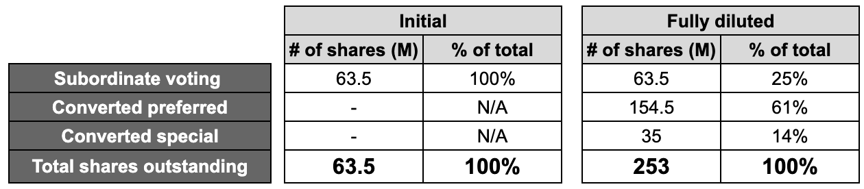 Each preferred share will be able to be converted for 2.43 voting shares, and each special share will be able to be converted for 3.43 voting shares. This conversion event makes the share structure dynamic. Below you can see how it’s expected to shift pre and post conversion: