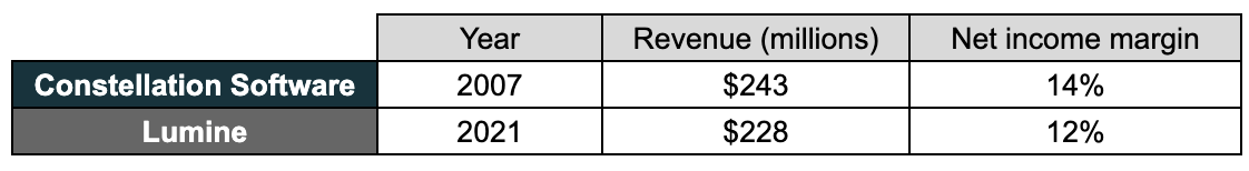 Directly comparing any company to Constellation will always be controversial, as it’s unlikely that even those from within will be able to achieve its success. However, if you want to draw a comparison, Lumine looks pretty similar to Constellation back in 2007 regarding company size and margins: