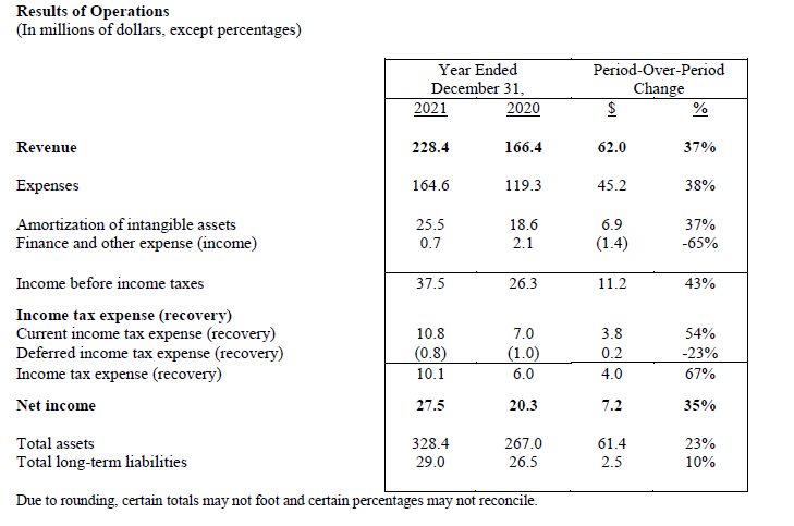 Regarding the income statement, Lumine generated around $228 million in revenue in 2021, growing 37% year-over-year and showing decent profitability with a 17% operating margin and a 12% net income margin: