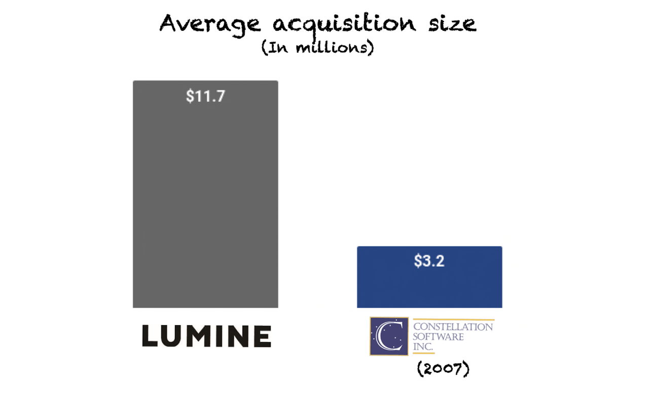 Lumine makes larger but fewer acquisitions than Constellation has historically made. For example, back in 2007, Constellation Software made 15 acquisitions while being approximately the same size revenue-wise as Lumine is today:
