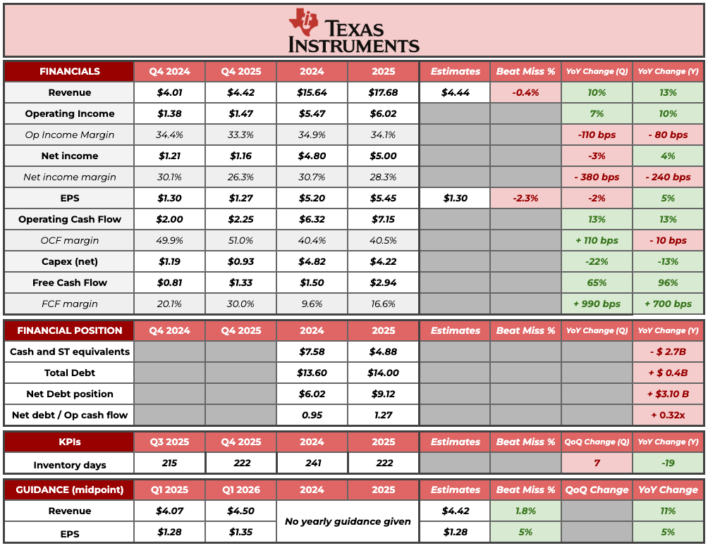 Let’s focus a bit on data center. Data center grew 70% in Q4 and generated roughly $450 million in revenue. Assuming that seasonality is non-existent in this market due to the continuous strong investment it’s receiving (data center has grown through seven consecutive quarters), we could say that data center is a $1.8 billion revenue run rate business for TI and its accelerating (Q4 growth was ahead of yearly growth). This ultimately means that Texas Instruments is slowly but steadily becoming an “AI company,” just what the market likes to see!