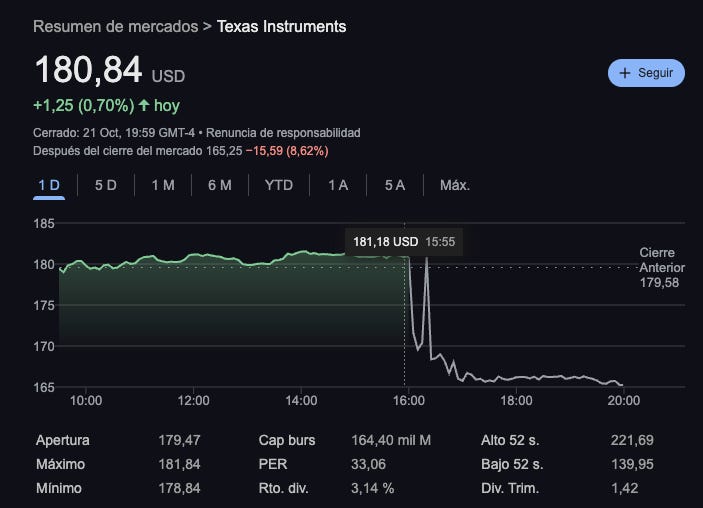 Texas Instruments reported a good quarter yesterday, with the stock following suit in after-hours trading. This is what I wrote last quarter with the stock down 9% after reporting earnings: