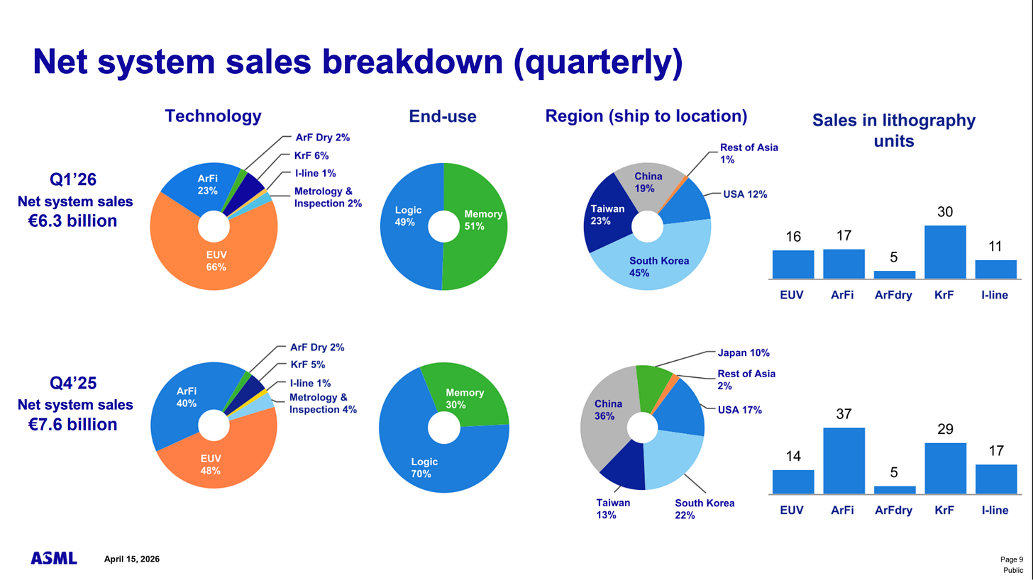 The AI infrastructure buildout and the memory shortage are somewhat shifting ASML’s geographic and product distribution. EUV sales are now account for 2/3rds of total sales, memory for half, and South Korea for a little less than half: