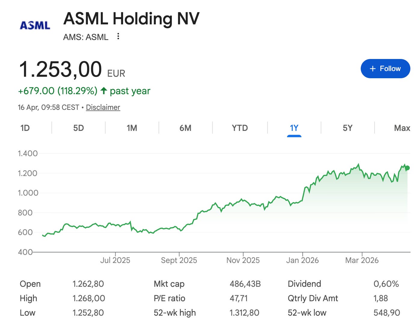 Despite the adverse market reaction, ASML reported good earnings on Wednesday. We need, however, some context to understand the market reaction. First, ASML’s performance over the past year has been exceptional and it’s now hovering around ATHs (i.e., the stock’s performance has been very healthy):
