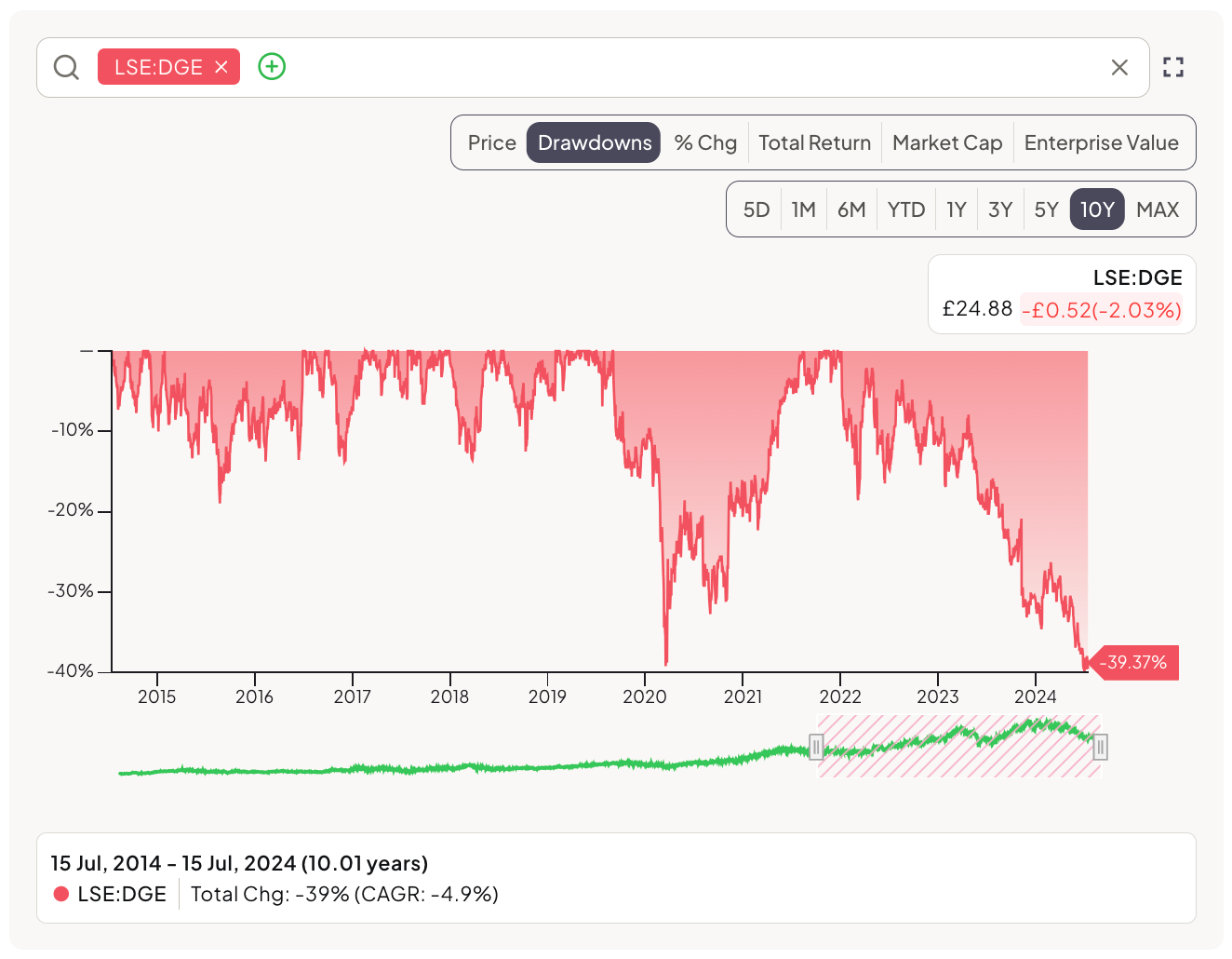 Diageo has also suffered some company-specific headwinds that have made the stock suffer quite materially. The stock is down 12% year to date, down 26% over the last year, and is almost in a 40% drawdown. Needless to say, sentiment has not been as negative as it is today for a very long time…