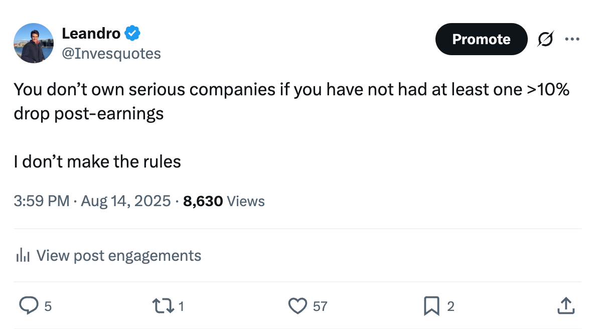 Another notable case is AAON (AAON). The stock dropped 18% initially following “bad” earnings. Management later mentioned that most of the drop had been caused by problems around the implementation of a new ERP. After the market considered the bump to be temporary, the stock rose 42% in two days and breached new ATHs! While these moves might not make much sense, I do think they bring some important lessons. The main lesson is that there seems to be a lot of money trying to guess earnings (the famous pod shops). This results in something interesting: when something inflects, it’s going to get repriced very quickly, meaning that it might make sense to be early rather than late. I read this week the Q2 letter of Praetorian Capital, which echoed some similar comments:
