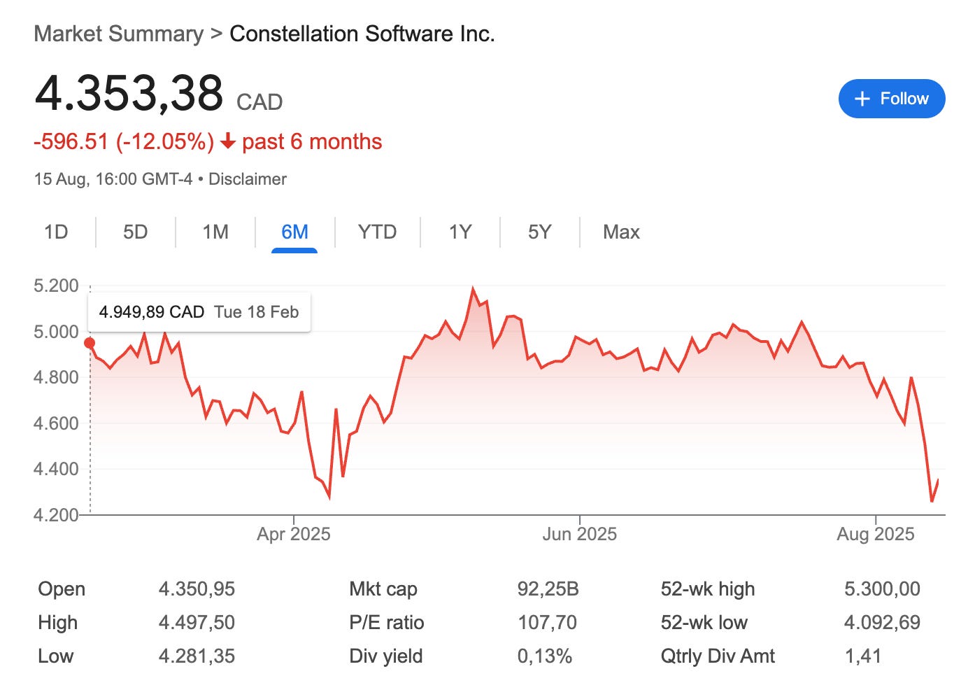The company reported solid earnings, both in organic growth and capital deployment (but especially the former). What might have happened here is that the narrative of “SaaS is dead due to AI” might have gotten hold of the stock. Constellation’s stock retested its April lows and was down almost 20% from its highs, something that doesn’t tend to happen often: