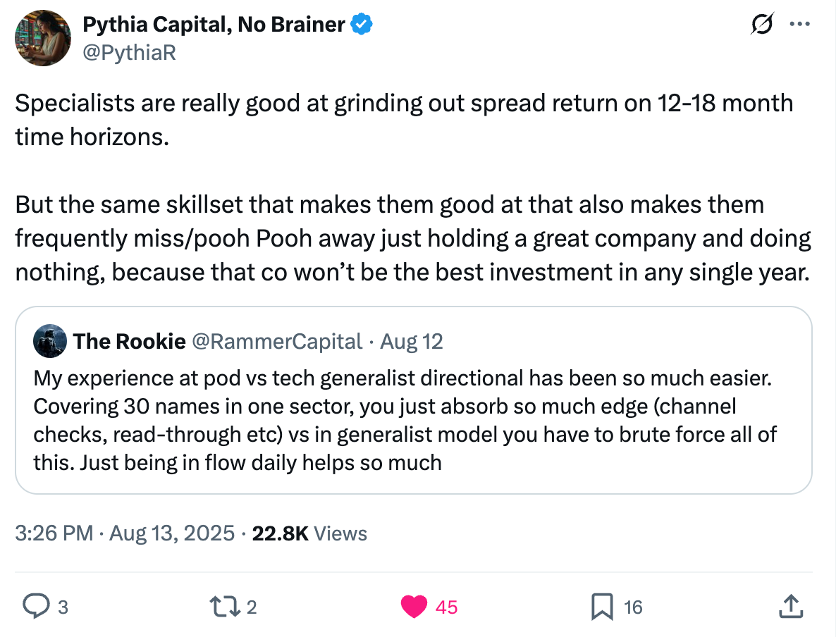 Another topic that I feel is interesting is that of “specialists.” If you are active on X, you probably have come across many specialists on any given topic (everyone is a specialist on geopolitics, by the way). This is somewhat normal because the investment industry is, to a great extent, organized this way. Now, many of these accounts think that, because they are “specialists,” they have a higher probability of forecasting the future. My POV is precisely the opposite. Because they are specialists, they sometimes tend to obsess over short-term topics that might be noise long term. At the same time, they sometimes struggle to focus on what matters long term. Some people think you have to be a specialist on any topic to have a view. While I do believe one needs to know what they are buying, knowing “too much” might give one a false sense of confidence and might be a roadblock to looking at the big picture. I agree entirely with this post: