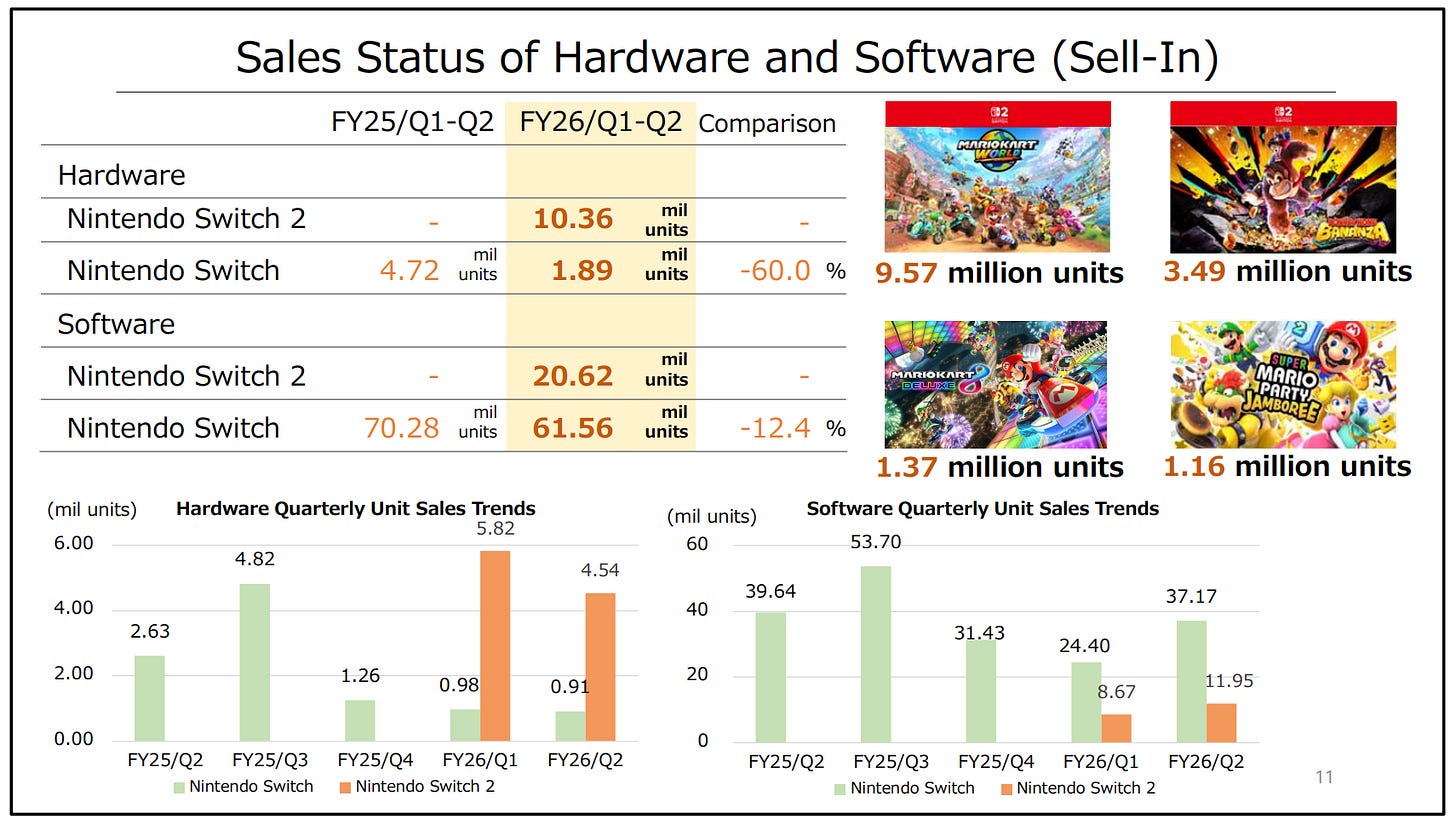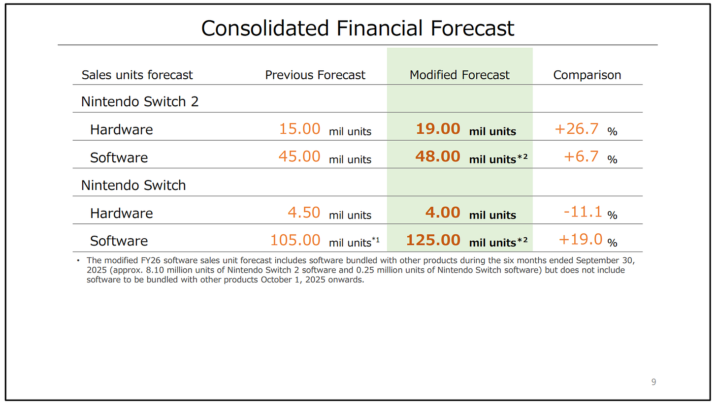 If we take the Q2 number (4.54 million Switch 2 Sold) and assume it will be similar in Q3 and Q4, we get to management’s guidance. The only problem with this thought process is that Q4 is the holiday quarter, in which sales should trend well above the 4.5 million figure. This, together with the recent rumors (discussed in a past NOTW) that Nintendo is asking suppliers to manufacture 25 million SW2 this year, makes me think the numbers are still conservative despite the considerable guidance increase. In short, management’s expectations might be higher than what they are communicating to the market.