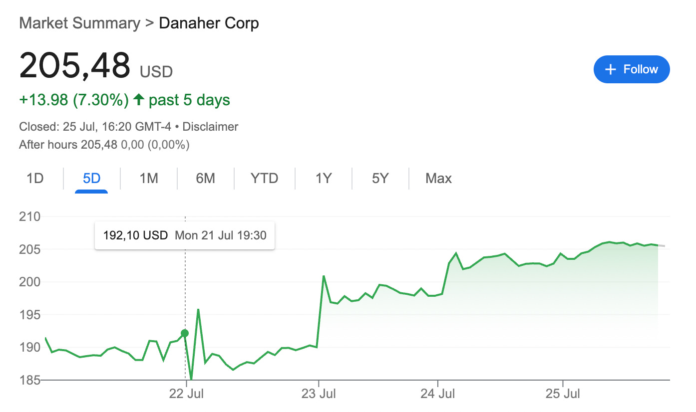 Danaher reported again a beat-beat-raise (sort of) quarter, and its stock initially did what it usually does: it dropped. Although it was a good quarter, it was likely not the kind of quarter that changes market sentiment. Other companies, such as Medpace and Thermo Fisher (one of Danaher’s peers), did somewhat “shift” the sentiment of the industry, causing Danaher’s stock to rise in tandem. Since reporting earnings, Danaher’s stock is up around 7%: