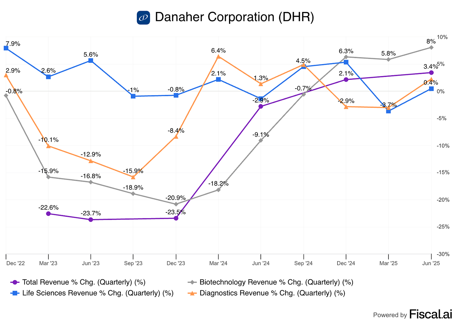 Growth rates are not yet where one would expect them to be, but it’s undeniable that the company (and the industry in general) is firmly recovering from the destocking period and all the noise the pandemic created. Before digging deeper into the numbers, here’s Danaher’s summary table: