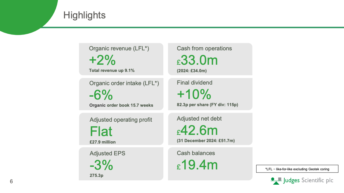Judges reported (as expected) soft 2025 earnings this week. The “rest” of the business was only just enough to counter the impact of the university funding freeze in the US. Revenue grew 2% organically (excluding Geotek) but orders and profitability struggled: