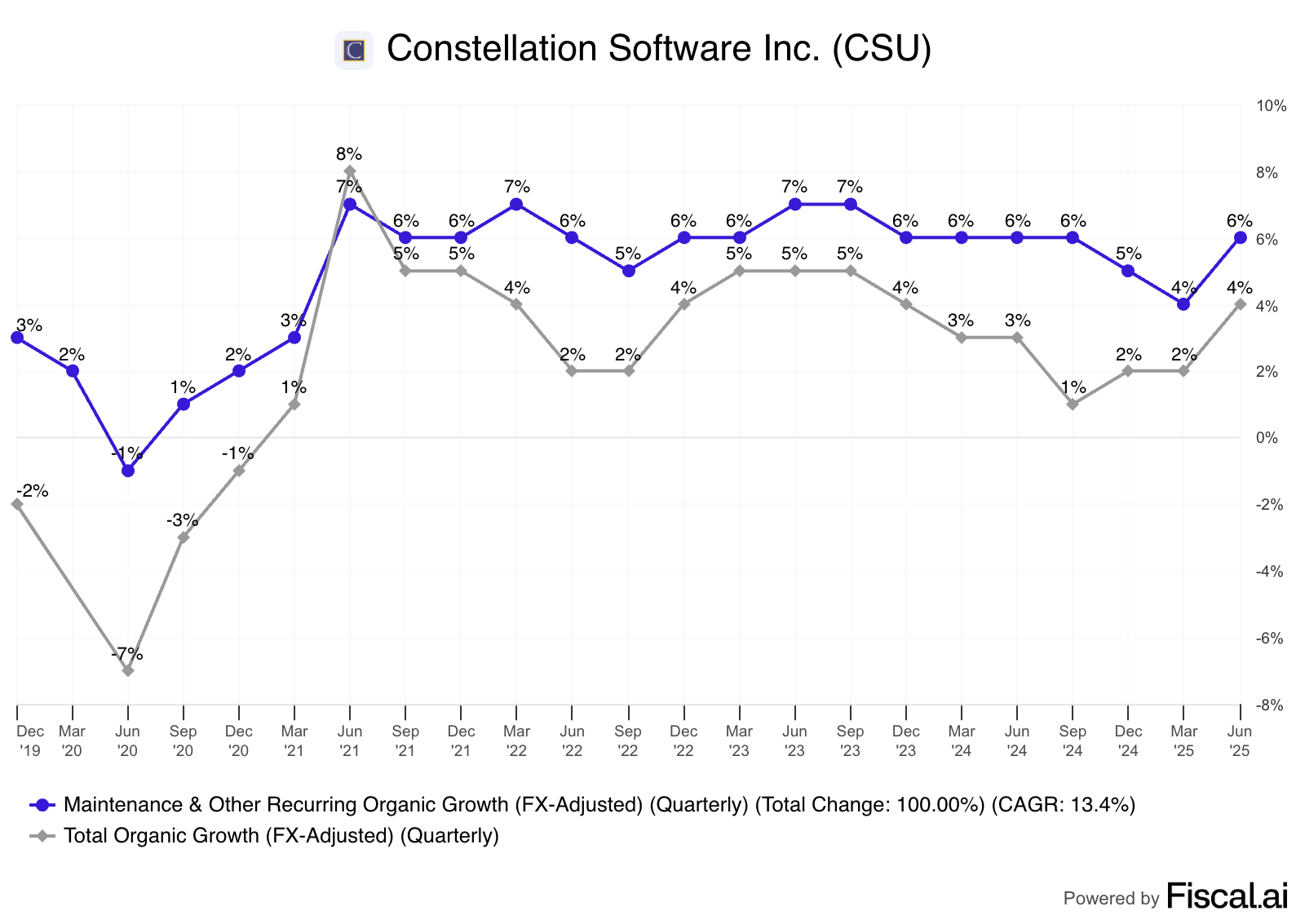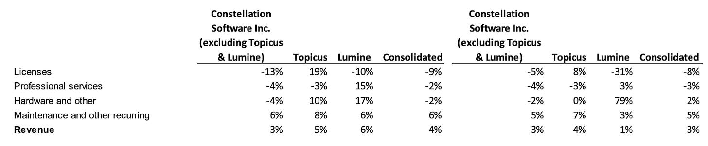 Then we jump right into the other highlight: organic growth. After a few quarters of lackluster organic growth, Constellation’s organic growth (on a neutral FX basis) accelerated, driven by strong maintenance and recurring organic growth: