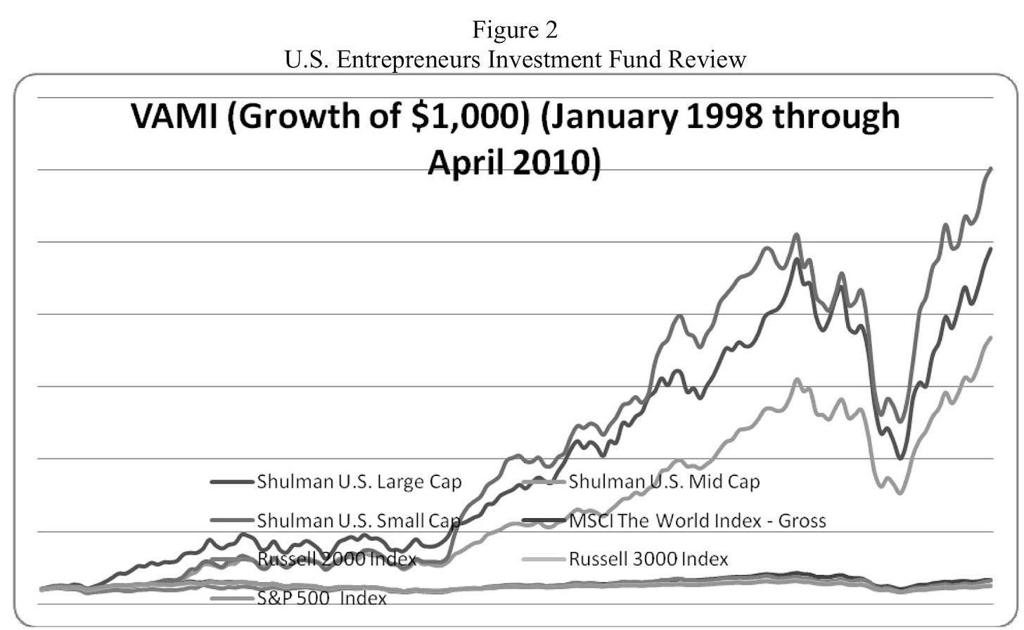 Over the entire period of the study, all three of the entrepreneur index benchmarks dominate the stock index benchmarks by a wide margin. During the 12 year 4 month period, the Small Cap entrepreneurs produce the strongest results, with an increase of 3,000%. Large-Cap entrepreneur portfolios experienced an increase from $1,000 to approximately $25,000 and Mid-Caps had an increase of $1,000 to approximately $19,000. By contrast, all of the key benchmarks including the Russell 3000, Russell 2000, S&P 500 and the MSCI World Index barely changed during the same time period.