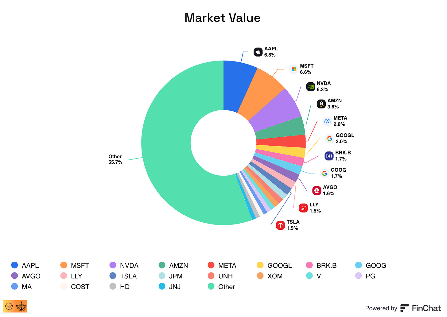 The top 20 holdings of the S&P 500 make up around 45% of the index, with the remaining 55% being comprised of more than 450 companies