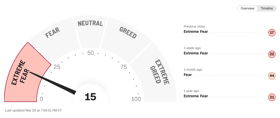 The fear and greed index worsened again and is in extreme fear. Together with the VIX rising significantly, it potentially means we are getting to attractive territory in terms of sentiment:
