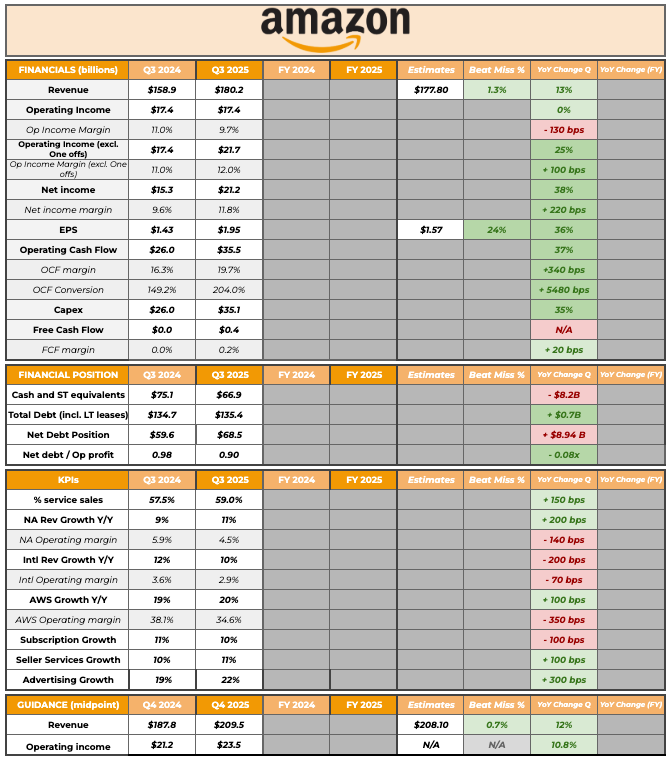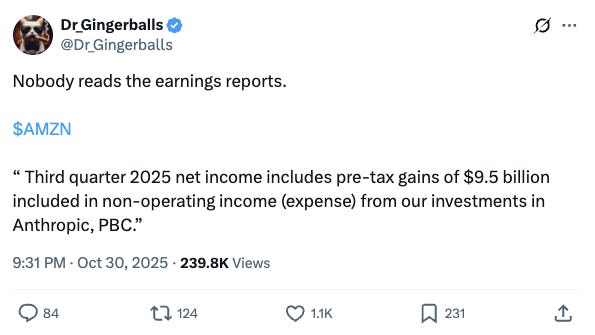 Excluding both, operating income would’ve been $21.7 billion, growing 25% year over year. I sometimes love the irony on X… someone can call others stupid for not reading earnings, only to make it blatantly obvious they didn’t read them either! Now, he is not wrong. Because Amazon uses the equity method to account for several investments in other companies (Rivian, Anthropic…), net income or EPS is not the best metric. Ignoring the one-offs here, what seems evident is that Amazon continued to grow at double-digit rates while expanding margins.