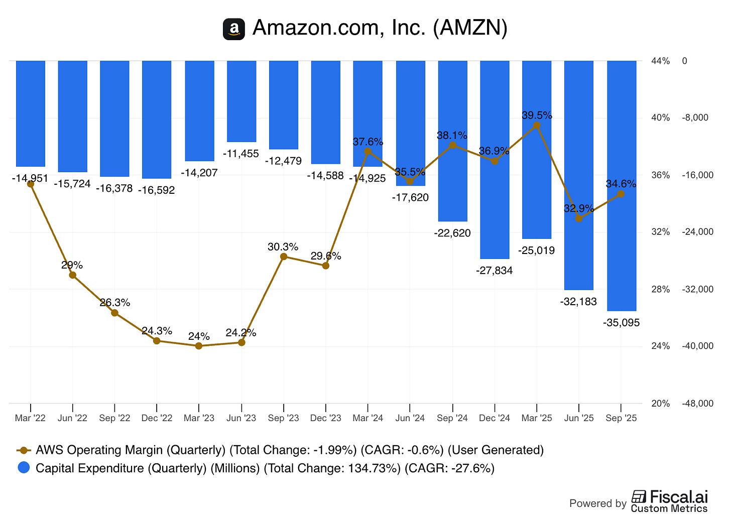 Both of these changes reduce depreciation expense and expand margins. However, in January 2025, Amazon rolled back some of these changes (reducing the useful life for a subset of servers and networking equipment from 6 to 5 years). This means that in 2025, AWS is facing a depreciation headwind to margins, which is further aggravated by an accelerated investment pace.