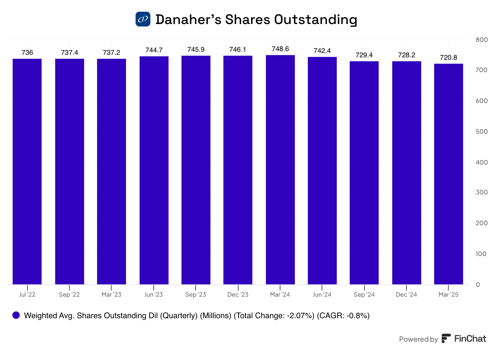 Buybacks continued this quarter. Danaher repurchased around $1 billion worth of stock in Q1, and shares outstanding are down around 4% after peaking in March 2024: