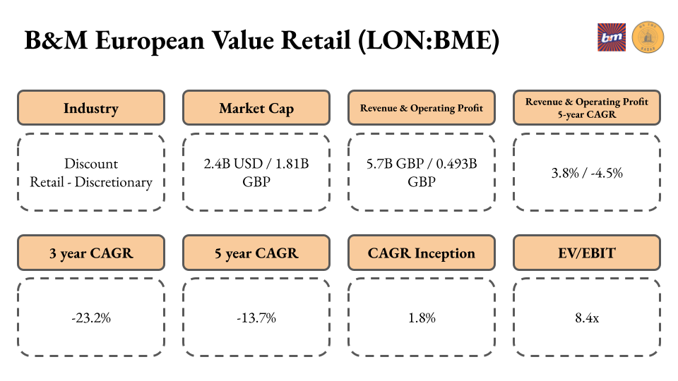 B&M is a UK-based discount retailer that operates in the UK and France. The company owns more than 1,000 stores which carry FMCG (Fast-Moving Consumer Goods) and General Merchandise items, almost in exact proportions (50/50).