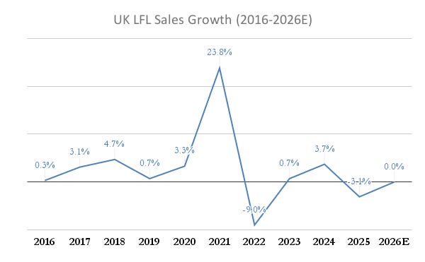 After a pandemic boom (B&M stores were considered “essential” during the pandemic), UK LFL growth weakened quite considerably.