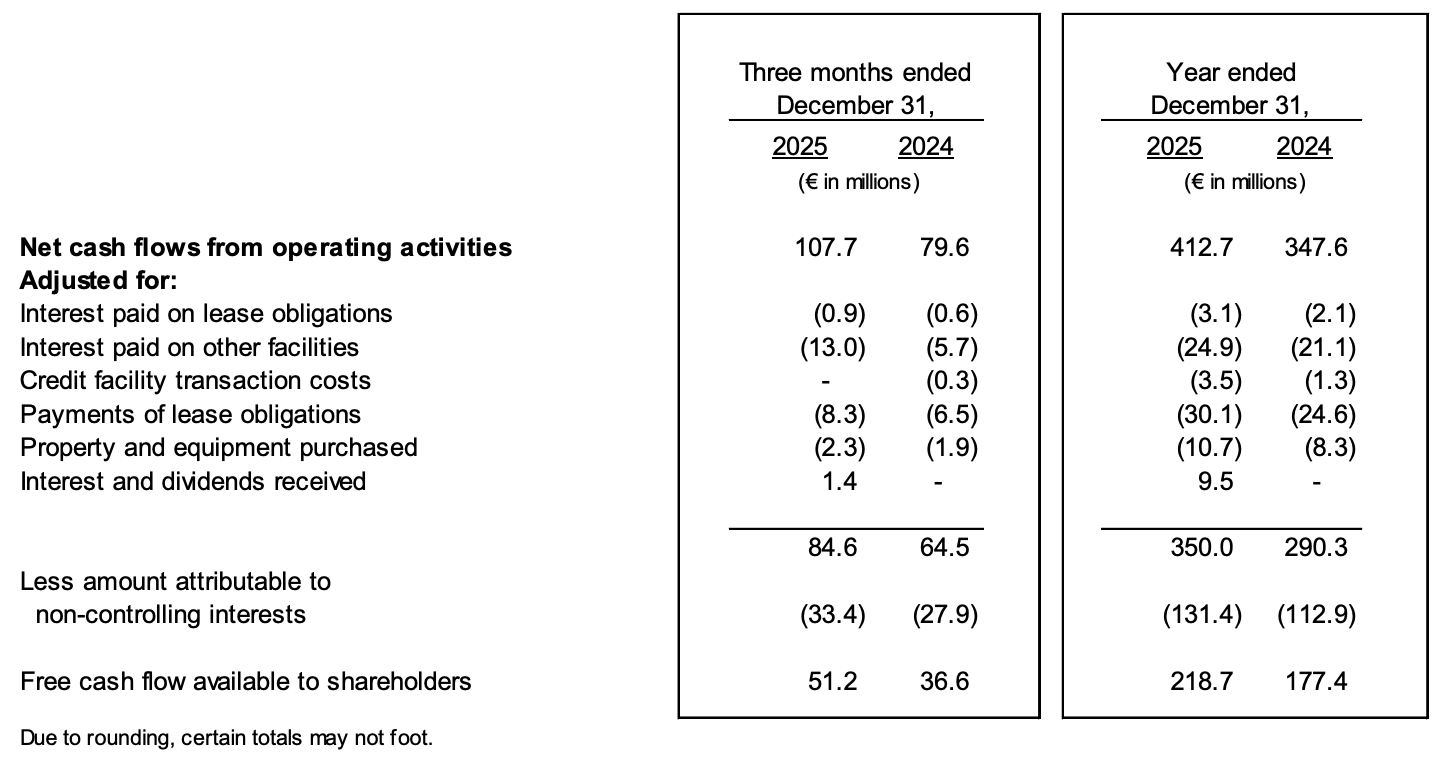 Earnings Before Taxes grew nicely (+29% YoY) during the quarter but saw a 41% decrease during the year. The yearly number is pretty misleading because Topicus is now accounting for its Asseco investment using the equity method. This has resulted in an adjustment to the P&L that drove a non-cash expense of €221.7 million in 2025. Did you need yet another reason to not focus on the P/E (besides amortization of intangibles)? Well, here you have it.